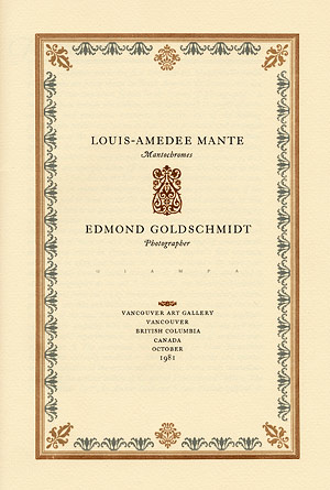 This small but very nice designed catalogue is about a Canadian exhibition of the works of the French photographers Louis-Amédée Mante and Edmond Goldschmidt, which took place at Vancouver Art Gallery in 1981.