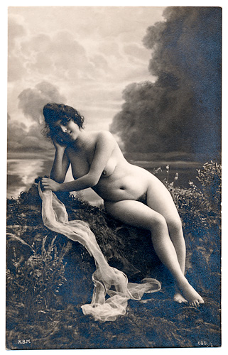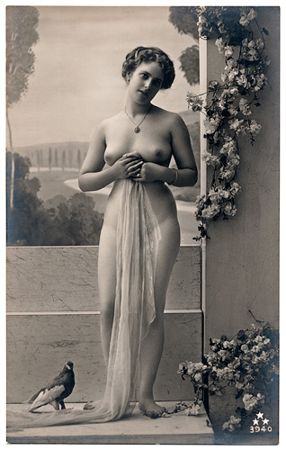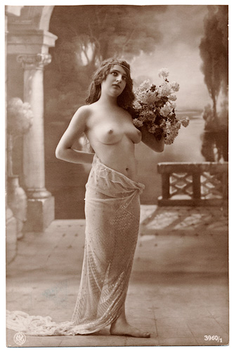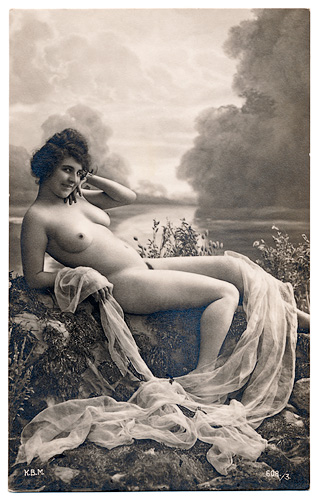Some of the French Postcards are in a more naturalistic style like classical paintings, and they got called "Italian Style". The models are usually shown in front of romantic background wallpapers. Props are sometimes just a veil or a thin scarf. The postcards don't show the typical erotic character of the French Postcards.