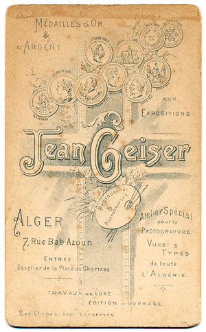 His parents had moved to Algeria in the 1850s. After the death of his father Lucien Jacob (†1852) and his two brothers (Louis Frédéric,†1868; Lucien James, †1872), both working in the atelier of his mother Julie Geiser and her partner Jean-Baptiste Antoine Alary, his mother Julie returned to Switzerland. Jean Geiser founded his own photographic atelier in Algier in the late 1860s at Rue Bab-Azoun 7, and took over the company of Alary & Geiser in 1874. Geiser's studio evolved to one of the most known and successful photo-studios in Algeria, with a subsidiary in Blida. Next to his studio photography, he covered all aspects of colonial photography on travels throughout the country. His business flourished especially by the success of printed photo postcards, which got more and more popular at the end of the 19th century. In France he gained high reputation as a photographer of orientalist and colonial photography and won several prizes and gold medals at photographic competitions, i.e. gold medal at Amsterdam 1892 and at the Exposition Internationale in Nice in 1901.